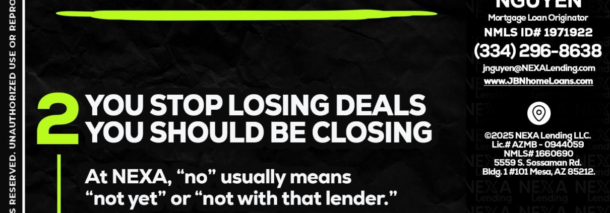 Hi, my name is Jenny Nguyen. I’m a Loan Officer with NEXA Lending LLC., offering personalized mortgage solutions, fast customized quotes, great rates and service with integrity.