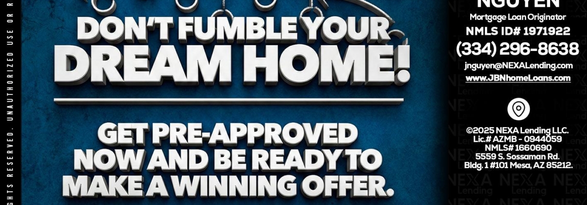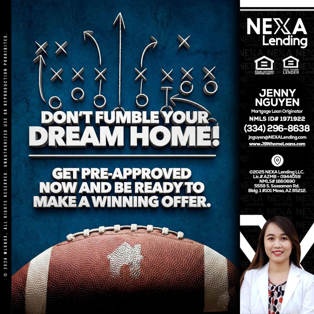 dont fumble - Jenny Nguyen -Mortgage Loan OriginatorHi, my name is Jenny Nguyen. I’m a Loan Officer with NEXA Lending LLC., offering personalized mortgage solutions, fast customized quotes, great rates and service with integrity.
