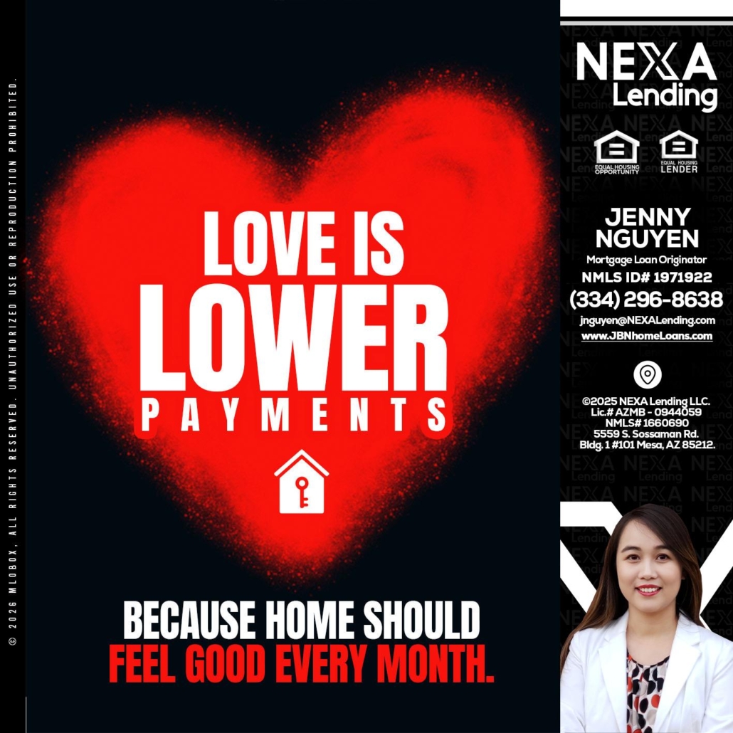 LOVE IS LOWER - Jenny Nguyen -Mortgage Loan OriginatorHi, my name is Jenny Nguyen. I’m a Loan Officer with NEXA Lending LLC., offering personalized mortgage solutions, fast customized quotes, great rates and service with integrity.
