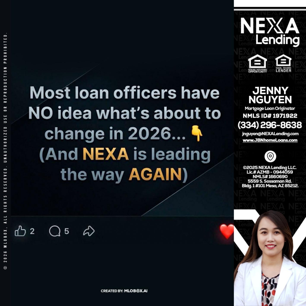 Hi, my name is Jenny Nguyen. I’m a Loan Officer with NEXA Lending LLC., offering personalized mortgage solutions, fast customized quotes, great rates and service with integrity.