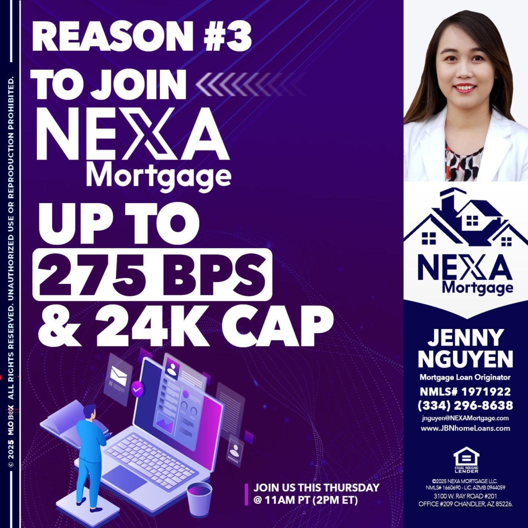 REASON 3 - Jenny Nguyen -Mortgage Loan OriginatorHi, my name is Jenny Nguyen. I’m a Loan Officer with NEXA Mortgage LLC., offering personalized mortgage solutions, fast customized quotes, great rates and service with integrity.